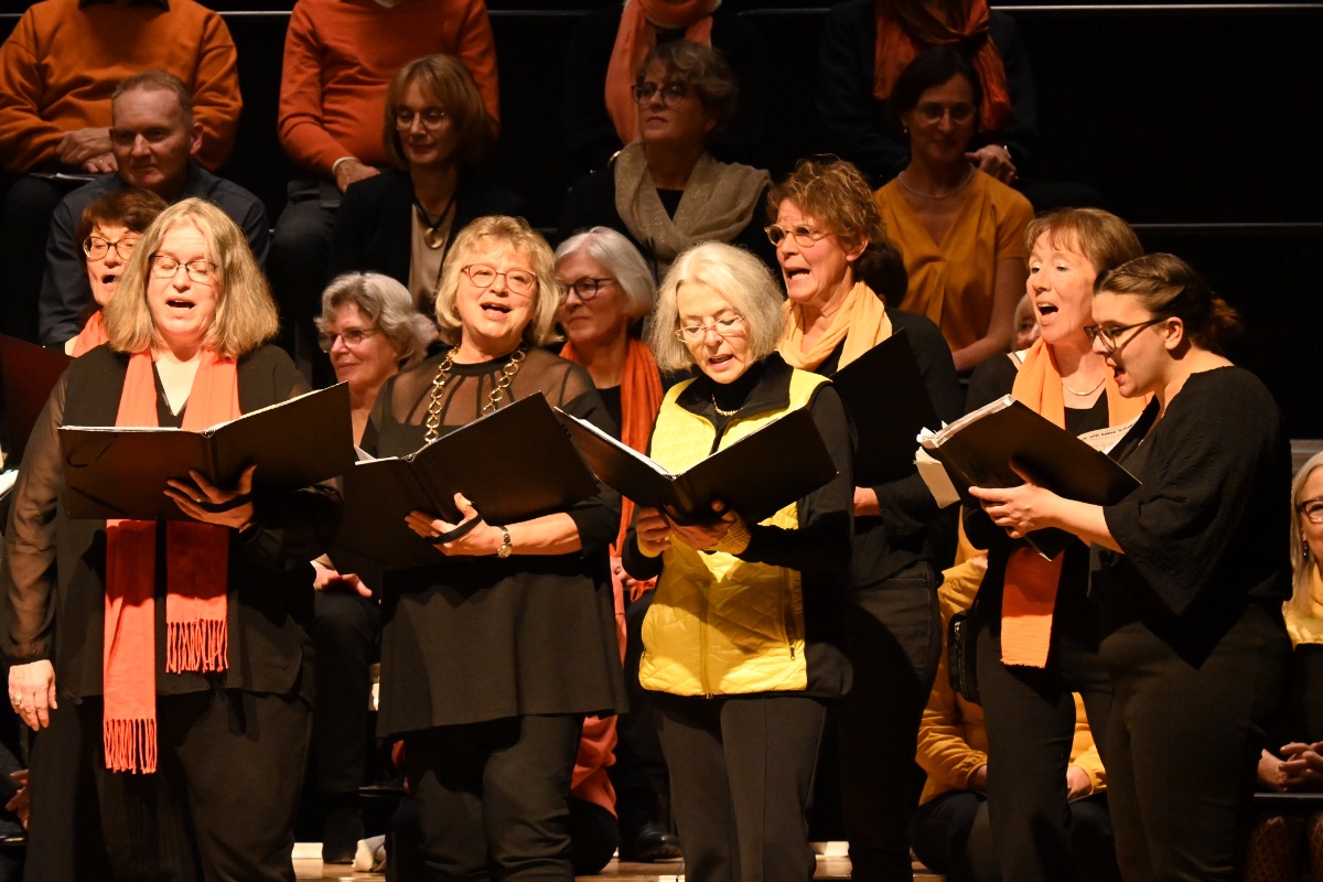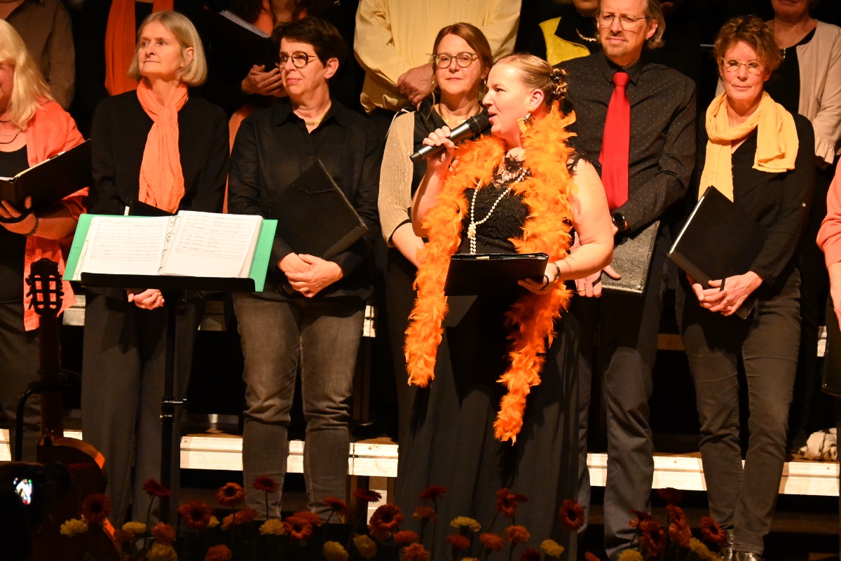 Neben dem Internationalen Chor trat auch der Frauenchor, eine kleinere Auskopplung der Sängervereinigung, mit mehreren Liedern auf. Ein besonderer Moment folgte kurz vor Konzertende: Mit dem Shanty „Wellerman“ schloss sich ein Kreis der Chorgeschichte. Nachdem der Chor ursprünglich als Männerchor gegründet worden war, durften erst seit 1911 auch Frauen mitsingen, und stehen heute, wie in vielen Chören, in der Überzahl auf der Bühne.
