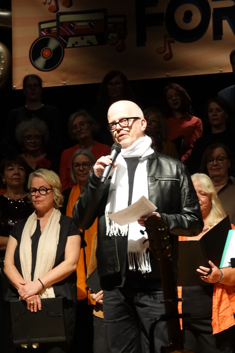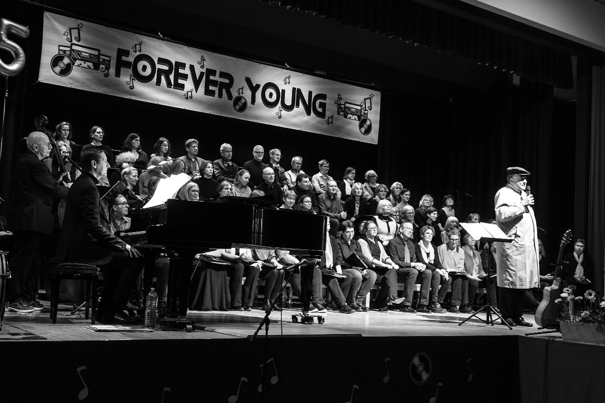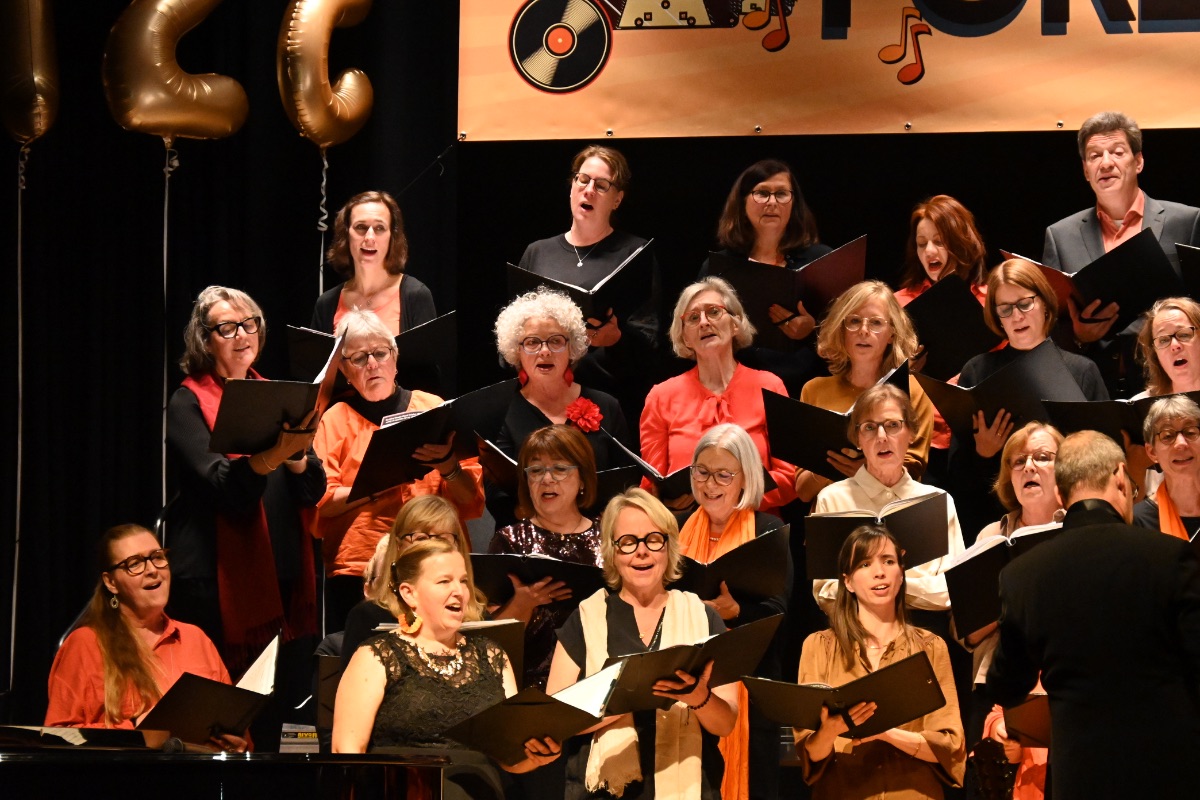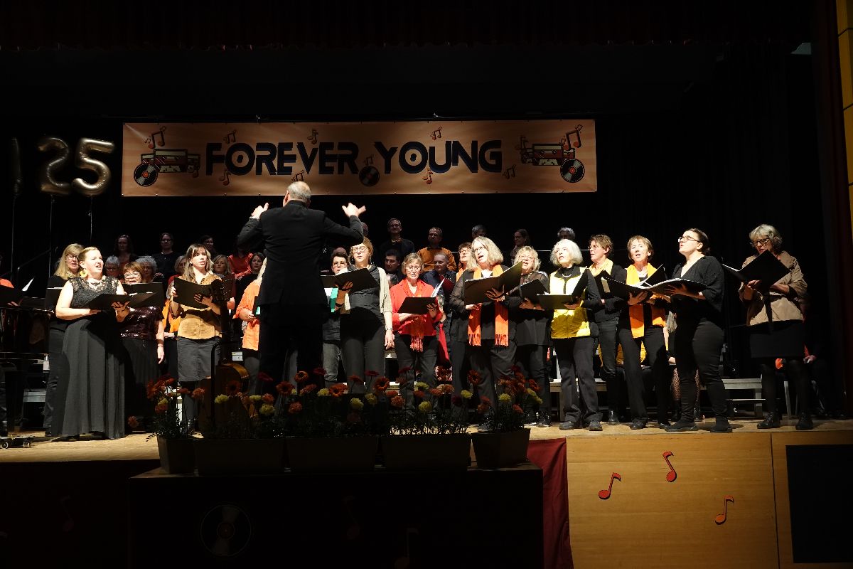 Passend zum Jubiläum lautete das „Geburtstagsmotto“ des Abends „Forever Young“. Das gleichnamige Lied eröffnete das Konzert und lieferte damit den Startschuss für insgesamt 19 Stücke. Die Sängerinnen und Sänger präsentierte sich unter der musikalischen Leitung von Chorleiter Oliver Krämer, begleitet vom bewährten Trio um Michael Stauss (Klavier), zusammen mit Hans-Joachim Weiß (Bass) und Christoph Sabadinowitsch (Schlagzeug).