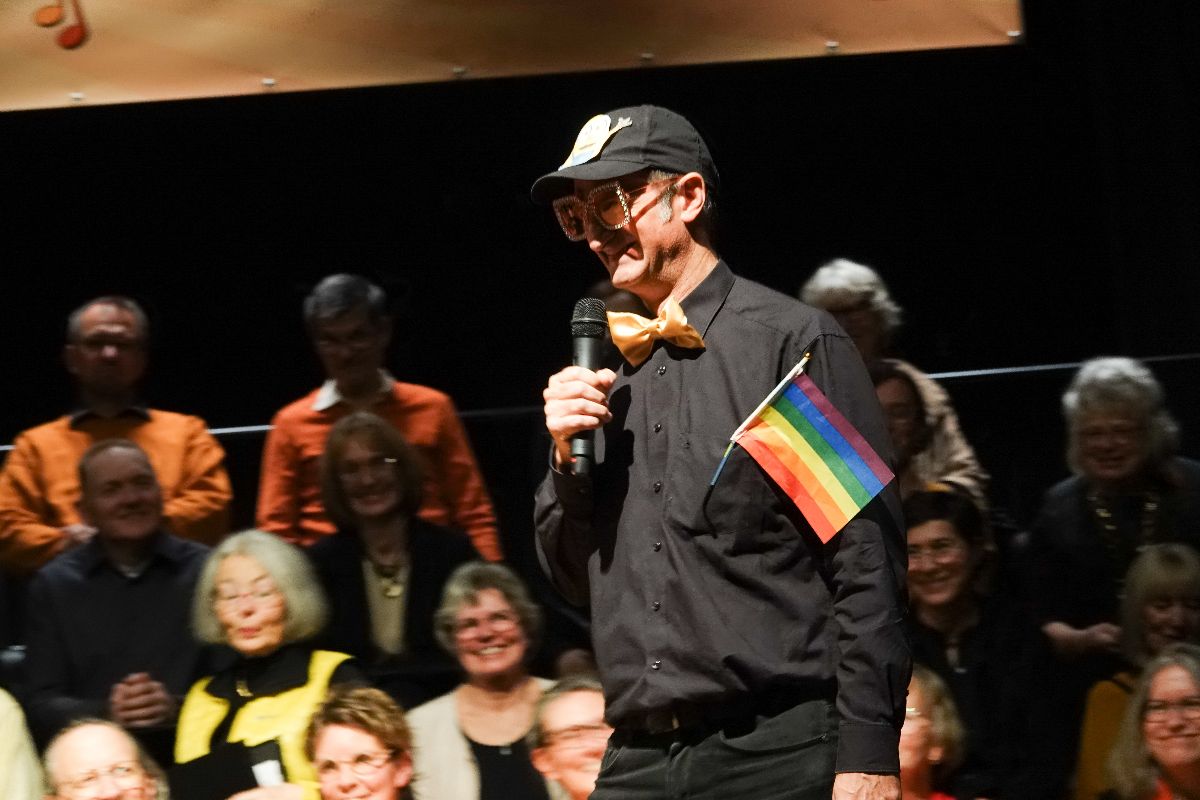 Informativ und unterhaltsam führten mehrere Moderatorinnen und Moderatoren durch den Abend. Sie erklärten nicht nur die Texte und Entstehungsgeschichten der Lieder, sondern passten sich auch optisch an: Mit einer Federboa für die 1920er, einem Peace Zeichen für die 1960er, einer Cappy für die 2000er und anderen Accessoires machten sie die Zeitreise nicht nur hörbar, sondern auch sichtbar.